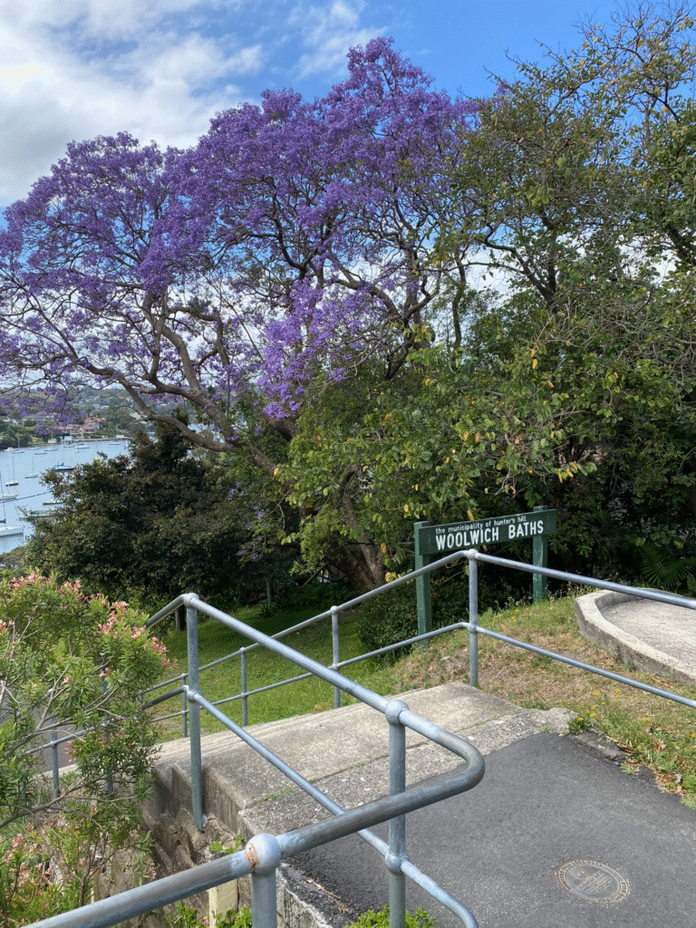 A Jacaranda tree overhangs the steps down to Woolwich Baths